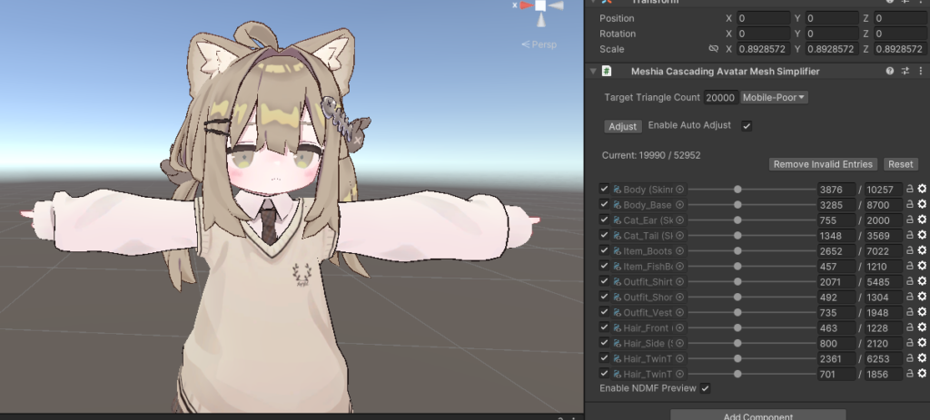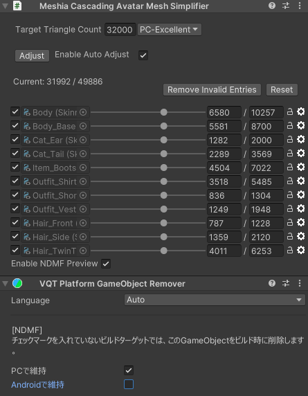 Android版の「Poor」ランク制限(20,000ポリゴン以下)をクリアするために、「Meshia Cascading Avatar Mesh Simplifier」 というツールを使います。 これは「目標のランク」を指定するだけで、アバターのパーツごとの削減率を自動で配分してくれる機能です。