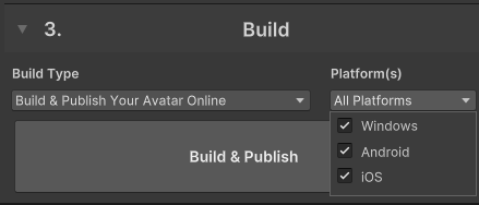 • VRChat SDKのコントロールパネルを開きます。Build & Publish画面で、「Windows」「Android」「iOS」すべてにチェックを入れる。あとは「Build and Publish」を押すだけ!