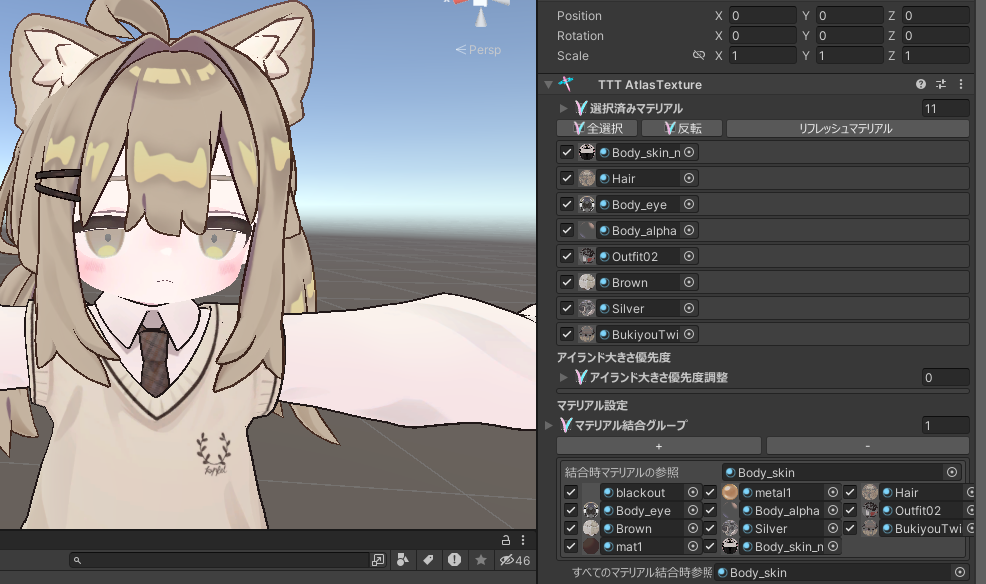 2. 統合するパーツの登録: AtlasTexture コンポーネントのInspectorにあるリスト(対象メッシュ一覧)を確認し、すべての項目にチェックを入れます。